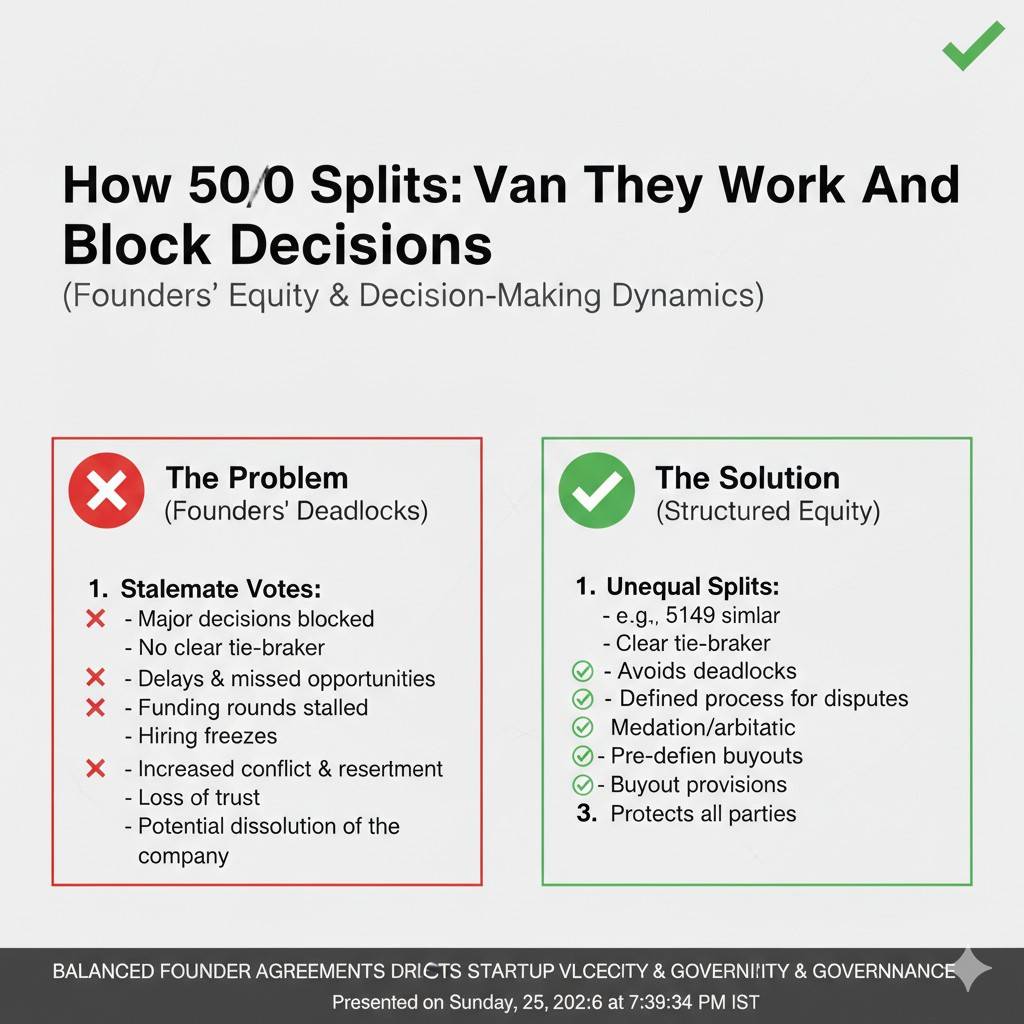 This is why many investors flinch at a true 50/50 split with equal control. They are not judging your friendship. They are thinking about what happens when, not if, you disagree.