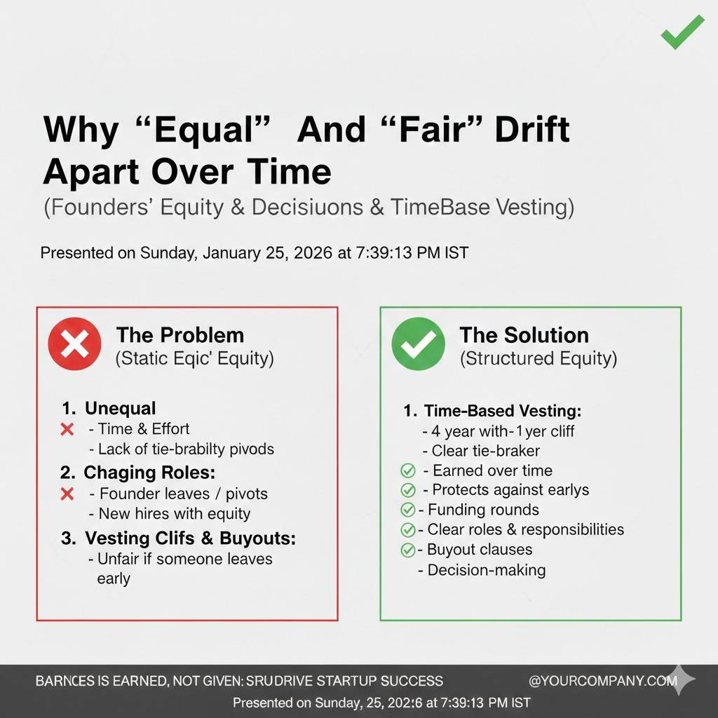 This is also where vesting matters. Vesting is not a trust issue. It is a fairness system for the future. If one founder stops showing up, vesting protects the company from being held hostage by dead equity.