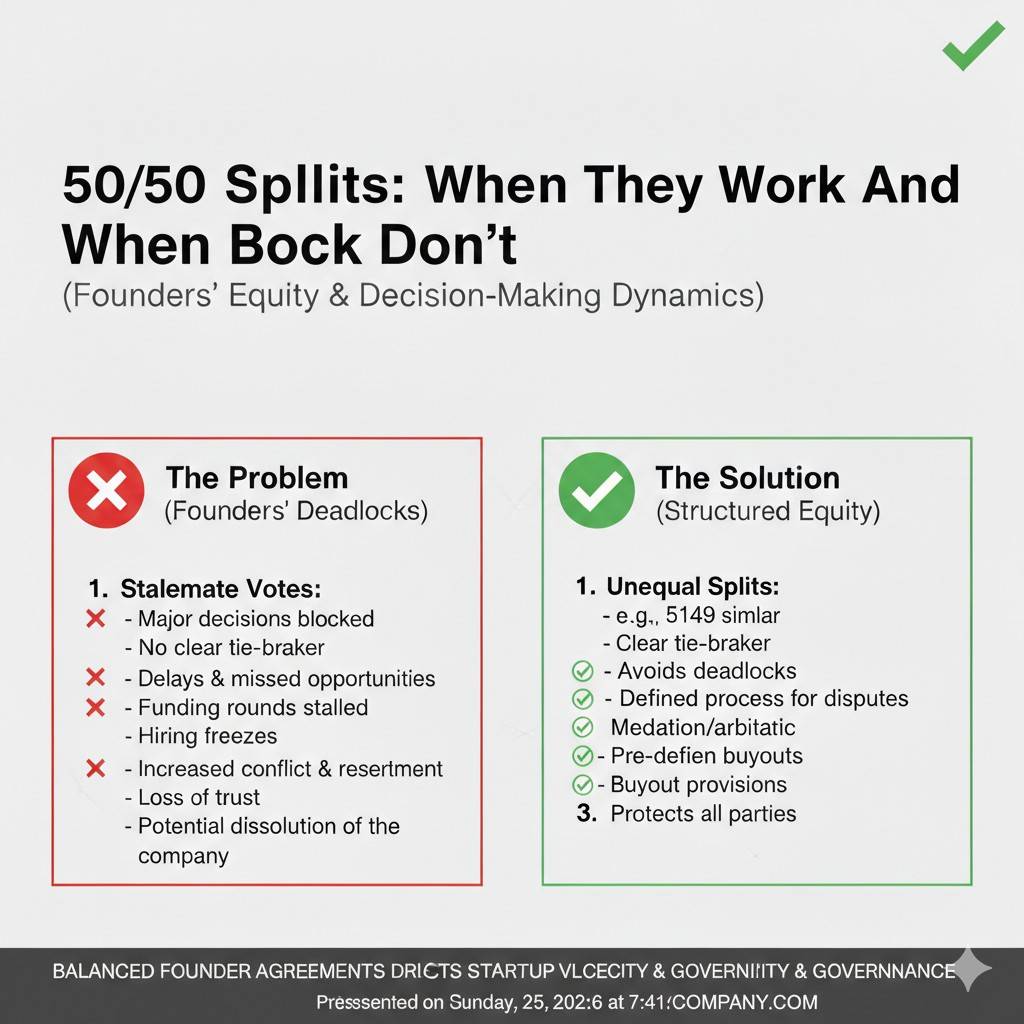 This article will help you decide when a 50/50 split is a smart move, and when it is a quiet trap. We will talk about how these splits fail in real life, how to spot the risk early, and how to set things up so you do not lose the company you are trying to build.