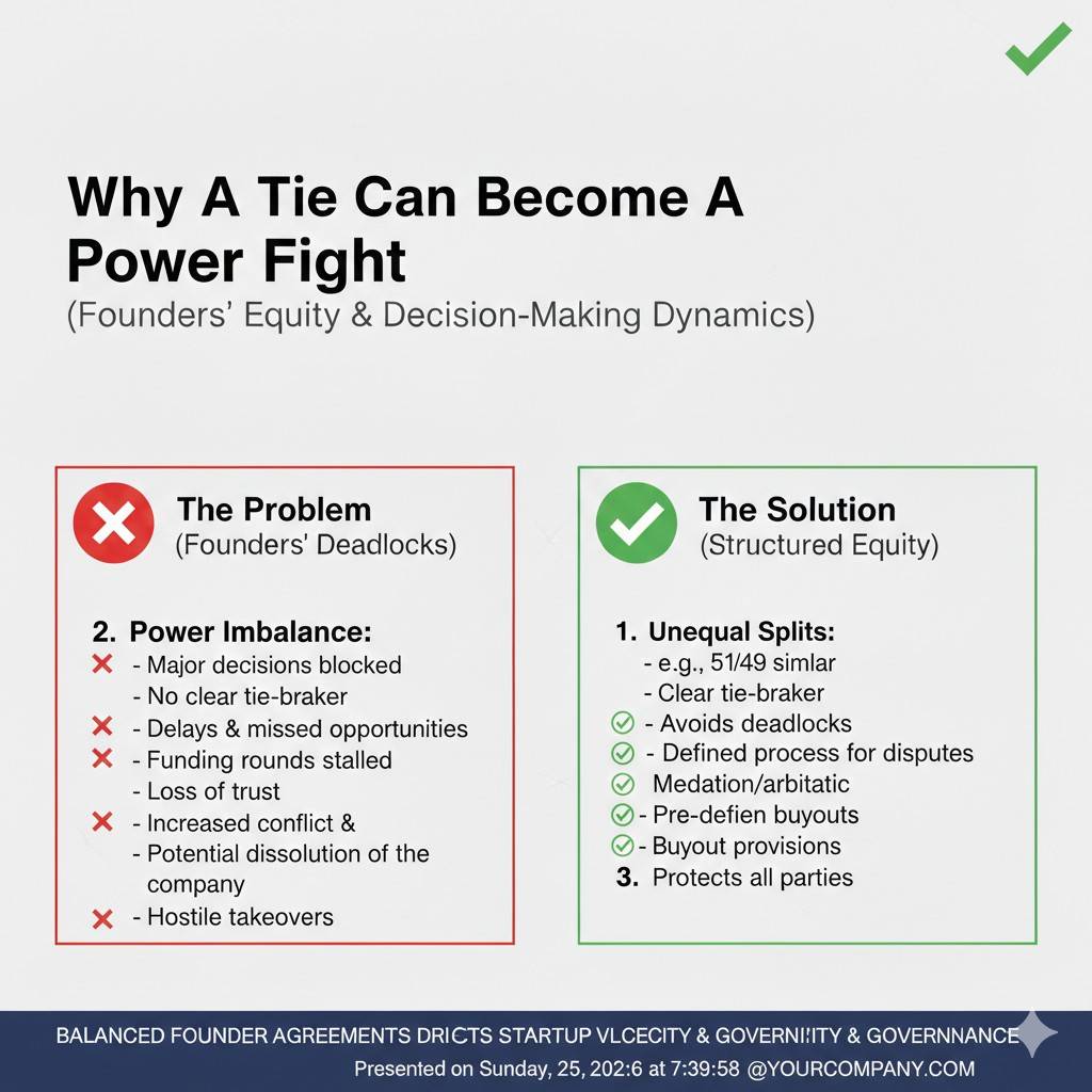 When two people own the same and have the same vote, a tie becomes easy. Ties feel fair in theory. In practice, they freeze the company.
