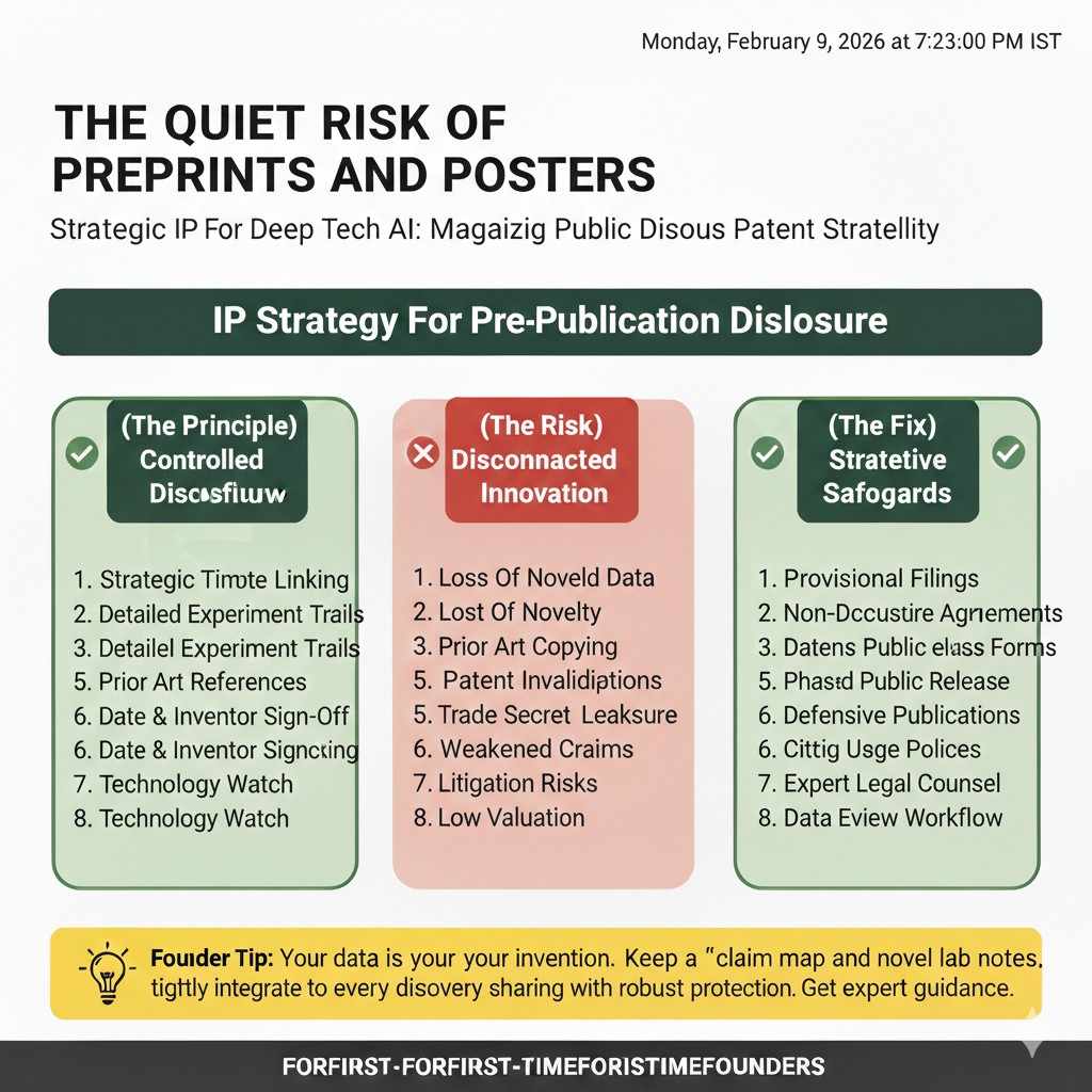 Preprints and posters are useful for hiring, credibility, and community. They can also quietly damage patent options if they include enabling details. Many founders do not realize how quickly a public disclosure can travel, get archived, and get used against them.