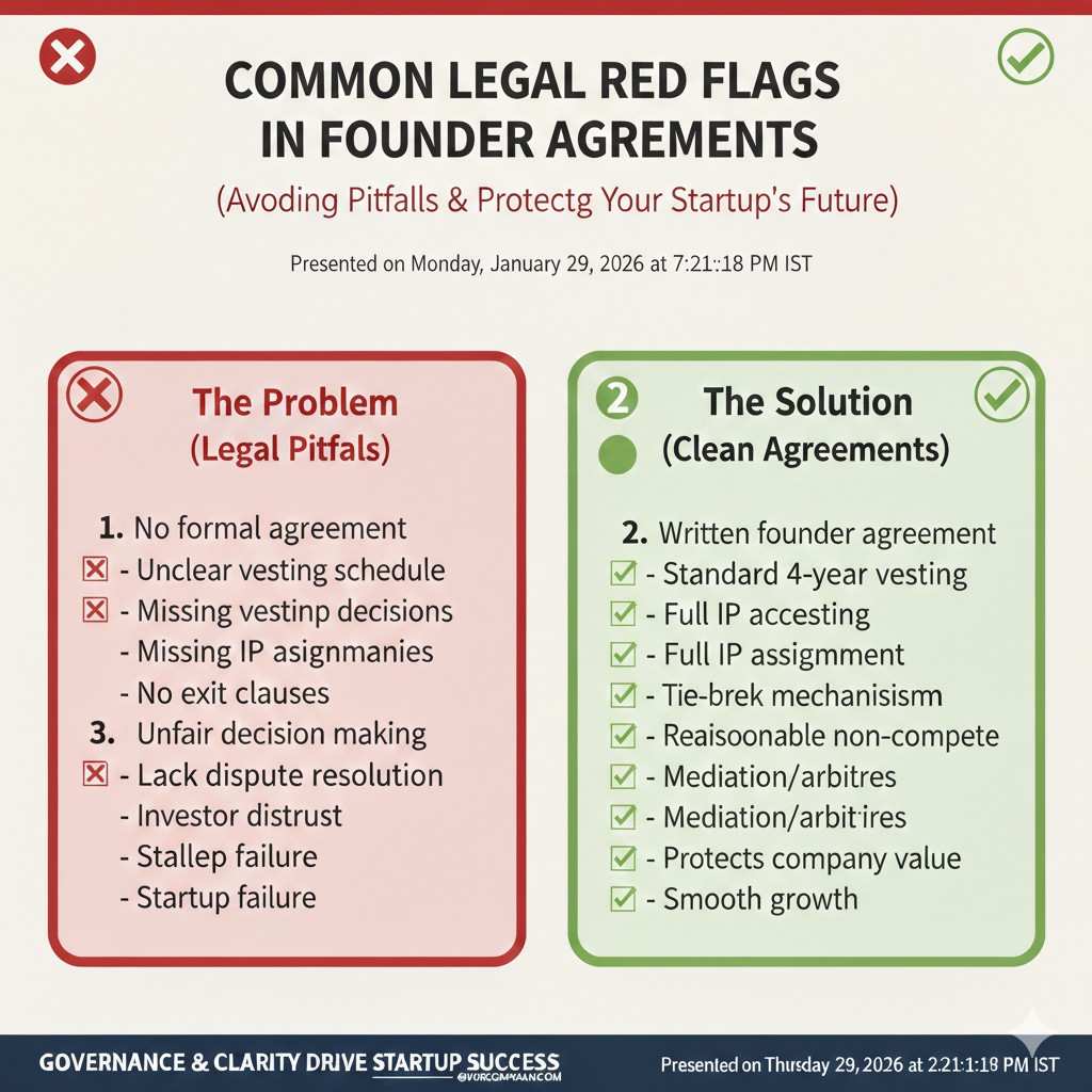 A red flag is not always “illegal.” Many red flags are simply weak language, missing terms, or default templates that do not match how startups actually work. They become dangerous when they collide with real life, like burnout, family emergencies, job changes, or a big pivot.