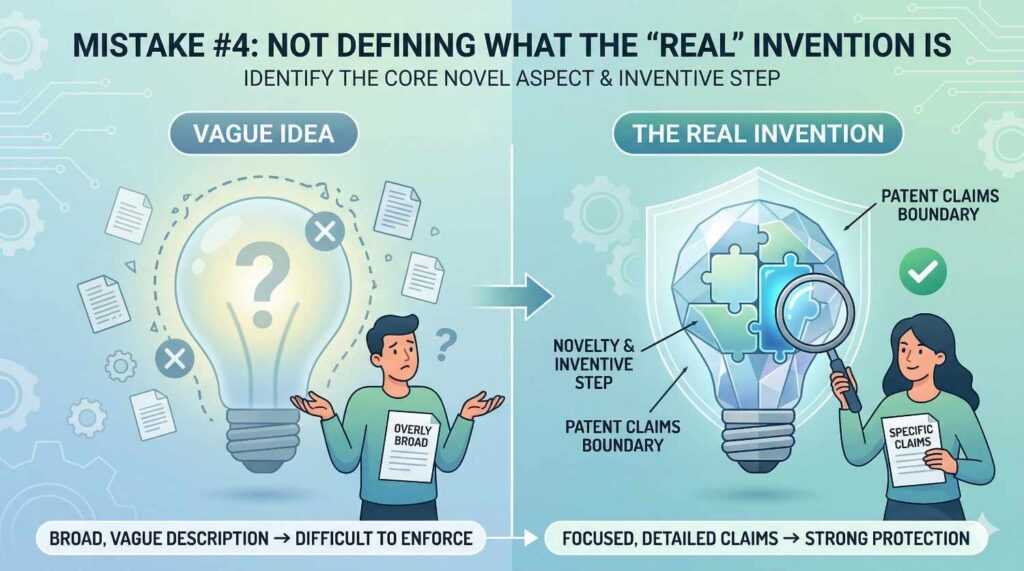 A patent is not about claiming everything you built. It is about protecting what is truly new and hard to copy. If you try to claim the entire system without clarity, your application becomes weak and easy to reject.