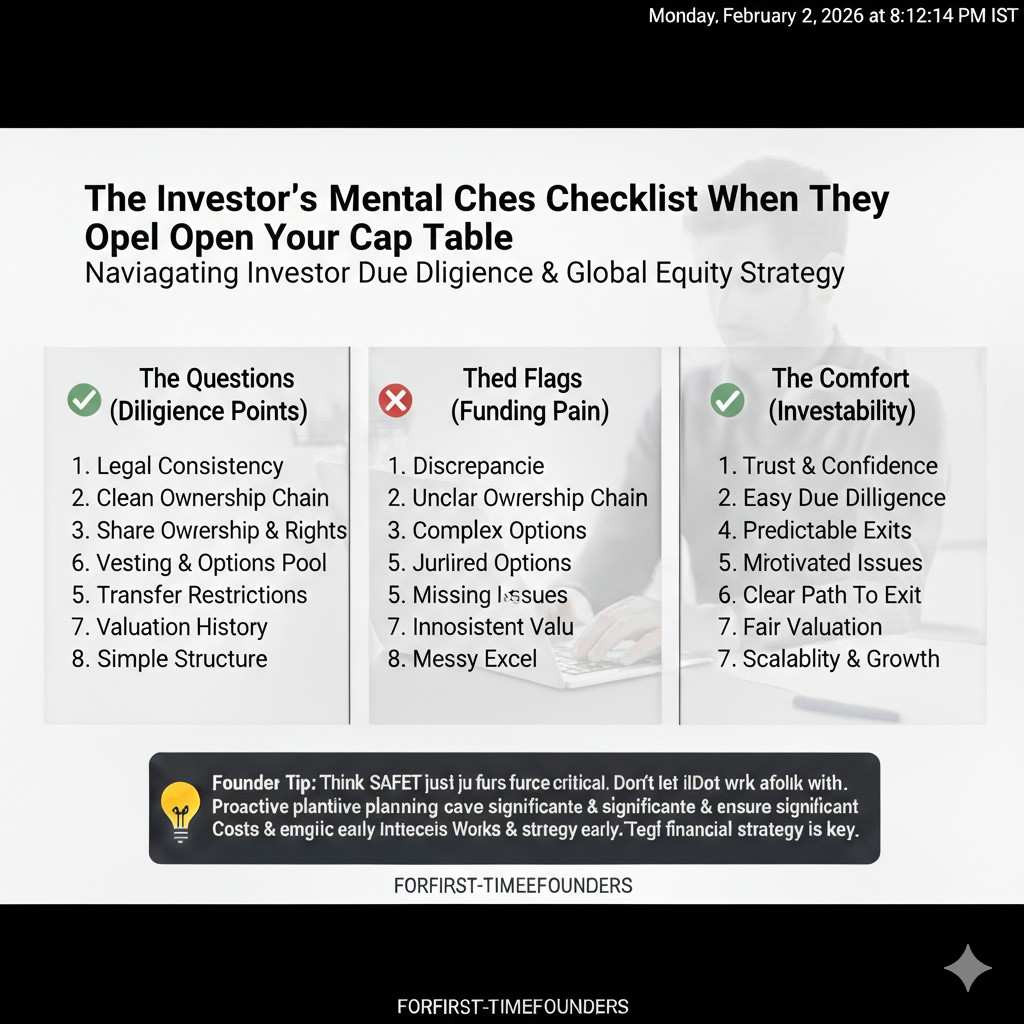 A VC-readable cap table is one where every line item can be traced quickly. If your counsel has to “interpret” the cap table, you will lose speed. If investors have to request multiple corrections, you lose trust.