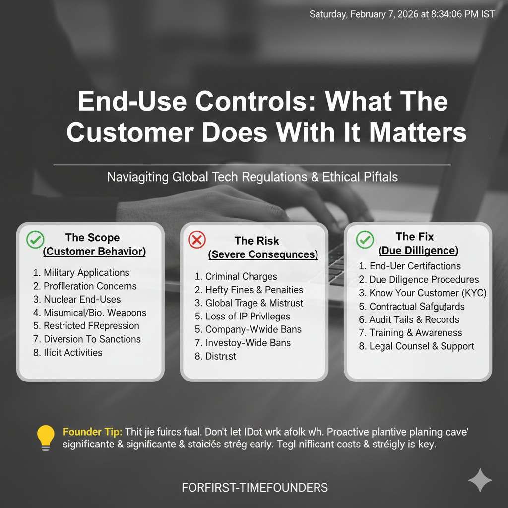 Founders often avoid asking end-use questions because they fear losing the sale. But ignoring end-use can be worse. If a deal later looks like you “should have known,” you can end up with risk that is hard to defend.