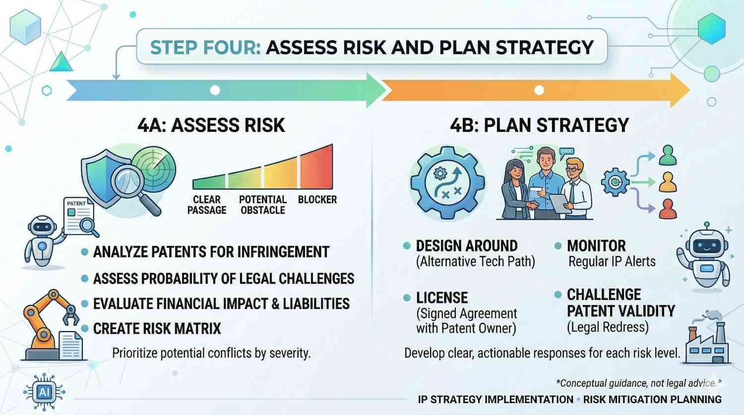 After reviewing relevant patents and comparing claims, the final step is risk assessment. Not every overlapping feature leads to disaster. Some risks are low. Some are manageable. Some require action.