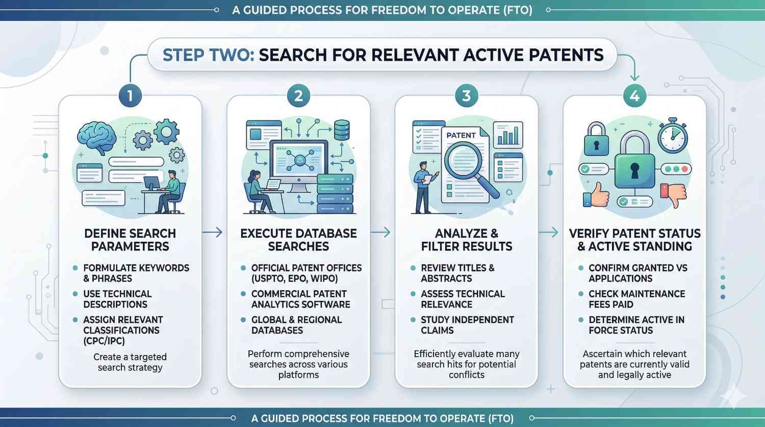 Once the product is clearly defined, the next step is searching for active patents that could cover it. This is not a casual keyword search. It is a structured review of issued patents and pending applications in relevant countries.