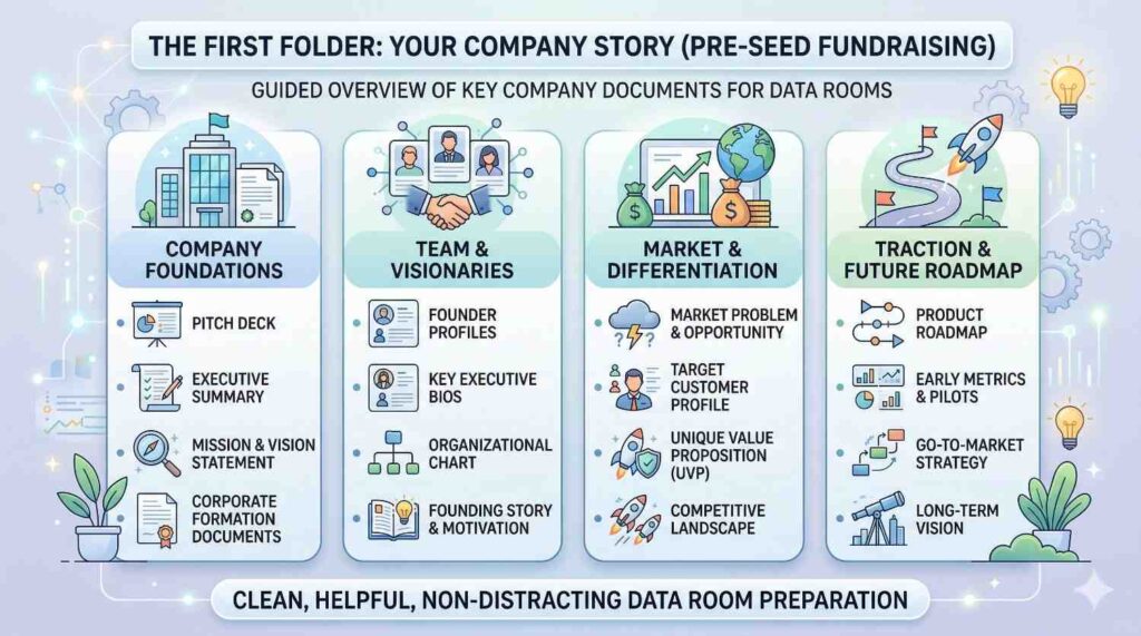 Many founders overthink this step. They assume they need dozens of complex legal documents. In reality, a strong pre-seed data room focuses on a few key areas.