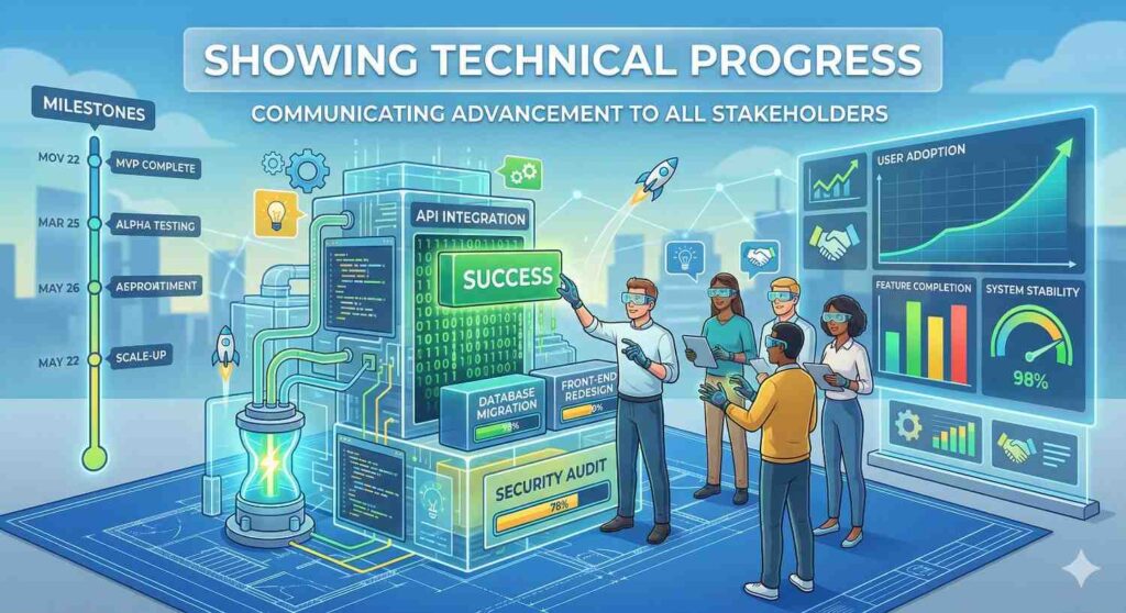 You can show early prototypes, system architecture diagrams, or internal research results. Even small milestones help demonstrate that the company is actively solving hard problems.
