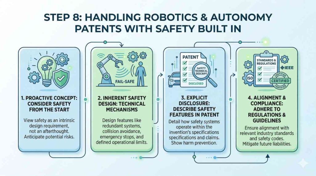 If your go-to-market is “trusted automation for regulated industries,” then your patents should reflect reliability, safety, monitoring, and controlled operation.