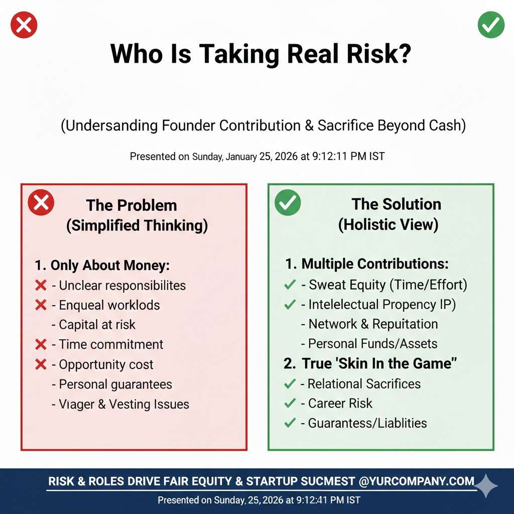 Risk is not about how passionate you feel. Risk is what you truly put on the line. If one founder quits a stable job, loses a paycheck, and uses savings to survive, they are taking a bigger personal risk.