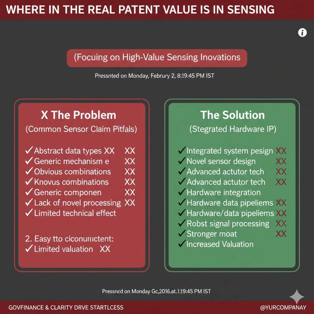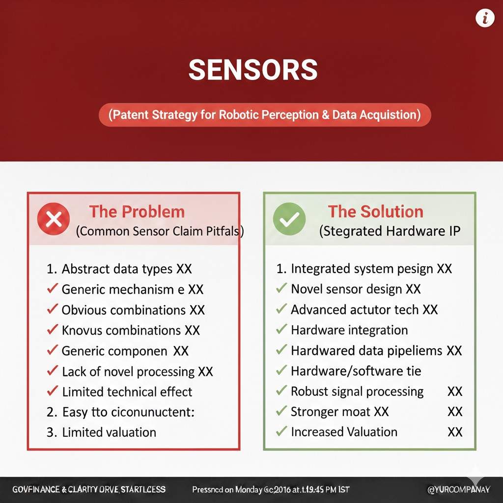 A strong sensor patent is not “we use a camera” or “we use LiDAR.” That is too broad and too common. The goal is to protect the specific way your sensor setup gets better results, like better accuracy in fog, lower drift, faster sampling without noise, or more stable readings when the robot shakes.