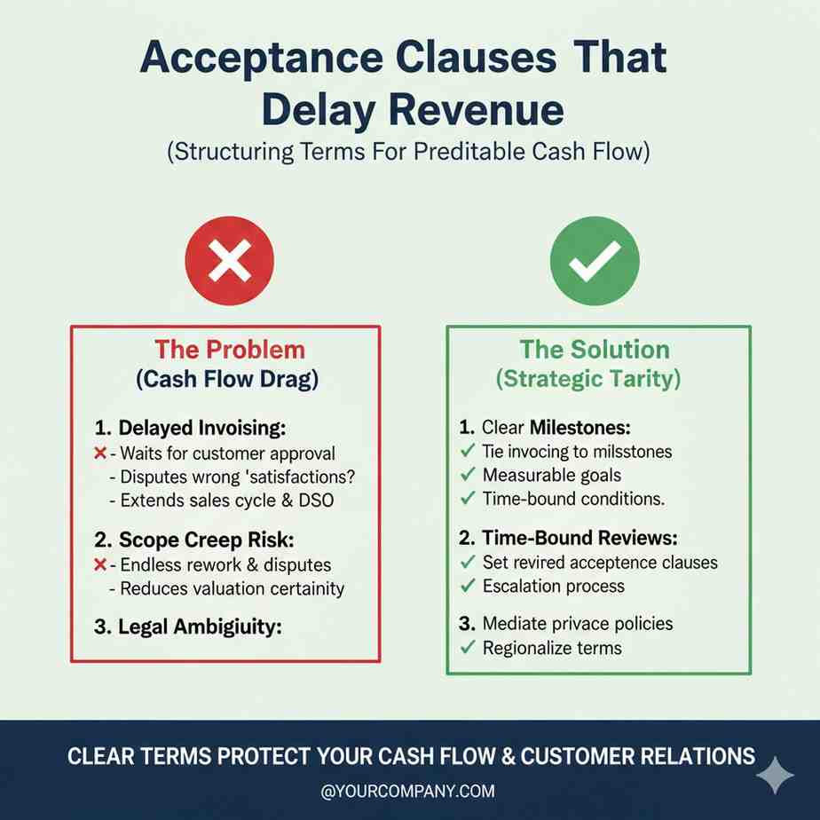 A cleaner pattern is to define acceptance tests, timelines, and what happens if the customer does not respond. Many agreements can include “deemed acceptance” after a set number of days. That small clause can prevent months of stuck revenue.