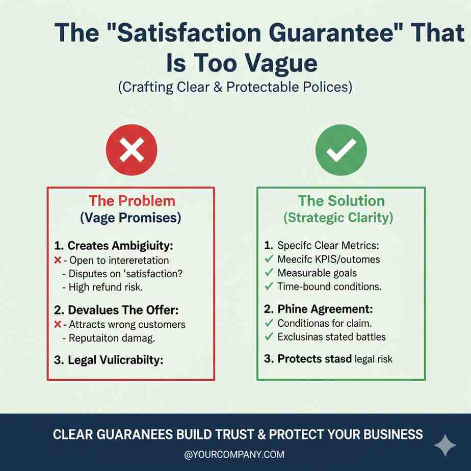 If the contract says “refund if not satisfied,” you may have created an open door that a buyer can use for reasons unrelated to performance. When terms are subjective, revenue confidence drops.