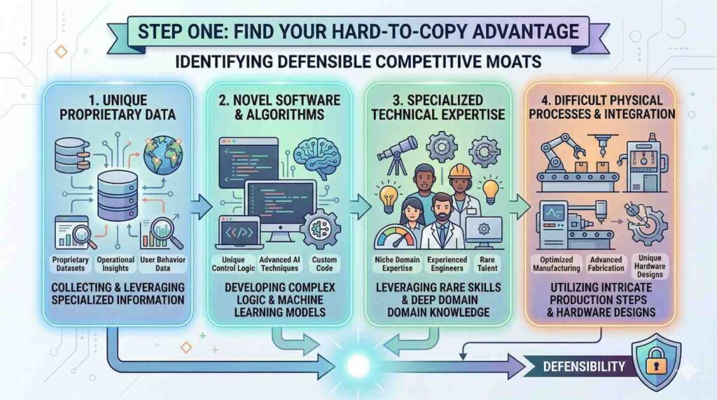 Imagine a strong competitor sees your demo tomorrow. They have money, talent, and a year of time. They can hire people with robotics PhDs and buy the same sensors you use. They can even copy your high-level idea.