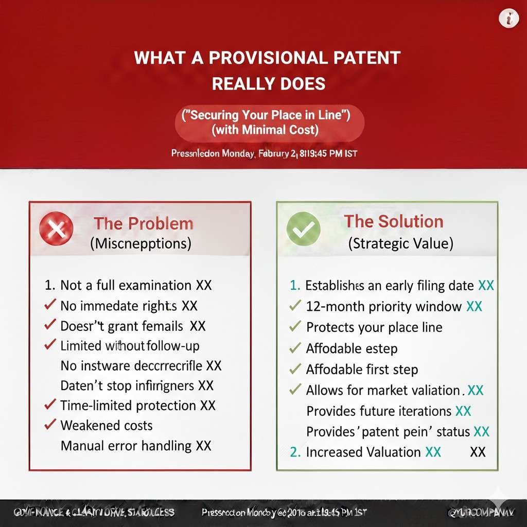 It is important to know what it does not do. A provisional is not the final patent. It is not examined. It does not turn into a granted patent on its own. It is a first move that gives you breathing room while you keep building.