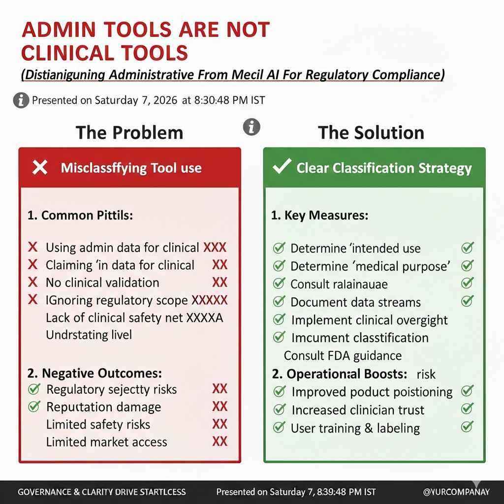 Some teams add “for clinician use only” and assume it solves things. It does not. The FDA cares about what the software does, not only who uses it. Clinician-facing tools can still be high risk, especially if they influence diagnosis or therapy.