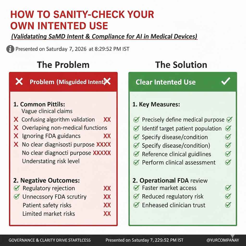 Intended use is the “job” you claim your software does. It comes from your marketing, website, pitch deck, demo scripts, and even what your sales team says. If you imply your AI detects cancer, the FDA can treat it as a diagnostic tool. Many teams get pulled into regulation by claims they did not realize were strong medical promises.